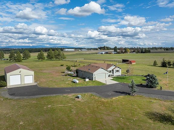 Multi generational home at its best! This meticulous rancher sits on nearly 5 acres. Highlighted with a heated 30x60’ shop! The wait is over. Your approach is a paved driveway with low maintenance landscape. Inside at 3000 sq ft, you have room for everyone; even an additional primary suite in the basement with the largest closet you have ever seen! This custom built home offers updated flooring, main floor spacious kitchen, newer appliances, pantry; adjacent open concept informal dining room & living room against a wall of windows with all the natural light & spacious views you could ask for. Perfect for entertaining off the composite deck. Main floor primary bedroom w/ walk-in closet, full bath en-suite, additional two bedrooms & full bath. In addition to a 4th bedroom the finished basement is complete without a massive game/craft or media room. So many options. Fenced acreage w/ additional 1 acre pen area for various livestock possibilities. Close to Fairchild AFB, shopping & all the West Plains offers!