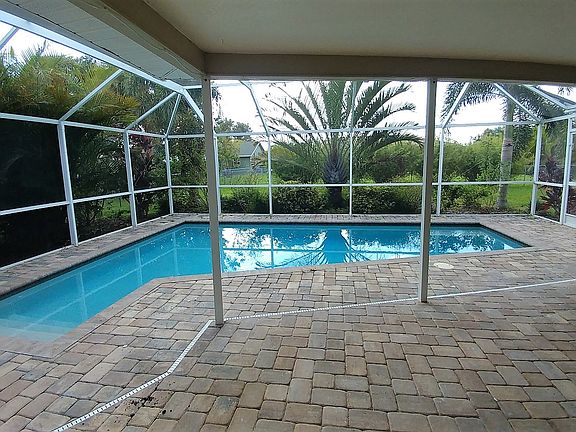 Incredible POOL home completely updated and meticulously maintained. New roof in 2013 and A/C installed in 2016 with additional duct work and air flow vents added throughout the house for maximum cooling efficiency. Ceiling fans in every room. Kitchen beautifully remodeled with granite counter tops, stainless appliances. Bathrooms have newly tiled shower/baths, and granite vanity's. Walk-in closets in every bedroom. A split bedroom floor plan with dining room and family room having pocket sliders that open onto a beautiful and spacious screened in lanai pool area. Lanai has beautiful paver stone. Backyard is fenced and lusciously landscaped, providing maximum privacy and a great place to relax. Multi-zone automatic sprinkler system and whole house water filter. High quality hurricane shutters installed on every window. This is a very desirable location, convenient to both Fort Myers and downtown Cape Coral shopping and dining areas. All assessments are paid. This home leaves you with nothing left to do but enjoy the Florida sunshine! washer and dryer convey with the house. -- Measurement provided by seller and believed accurate but must be verified by buyer and/or buyer agent.