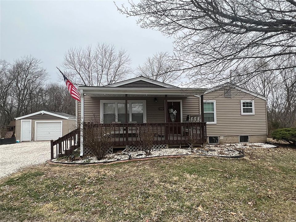 Completely Updated 3 Bedroom 2 Full Bath Ranch on 1 Acre in Seckman Schools! This home offers a covered front and back porch, huge open floor plan with high quality wood laminate flooring through out great room, dining room, kitchen and 3rd bedroom, ceramic tile flooring in bathrooms, and carpet in master and second bedroom. Special woodwork, shiplap, wood beams, and stylish light fixtures through out! Enjoy 6 panel doors, walk in closets, main floor laundry, fresh neutral paint, updated bathrooms, new septic system and drain field 4+/- years, new aerator 2 years. 8 years HVAC, and hot water heater, panel box, all windows dbl hung tilt in. 2018 roof on house & garage, gutters, downspouts, soffits, facia. Garage sub panel updated 2022 and foundation doctors water proofing for basement 2021. The detached garage offers parking and or a great man cave or work shop! Plenty of room for an additional out building or pool! This home has so many updates & charm! Copy of Survey will be on site.