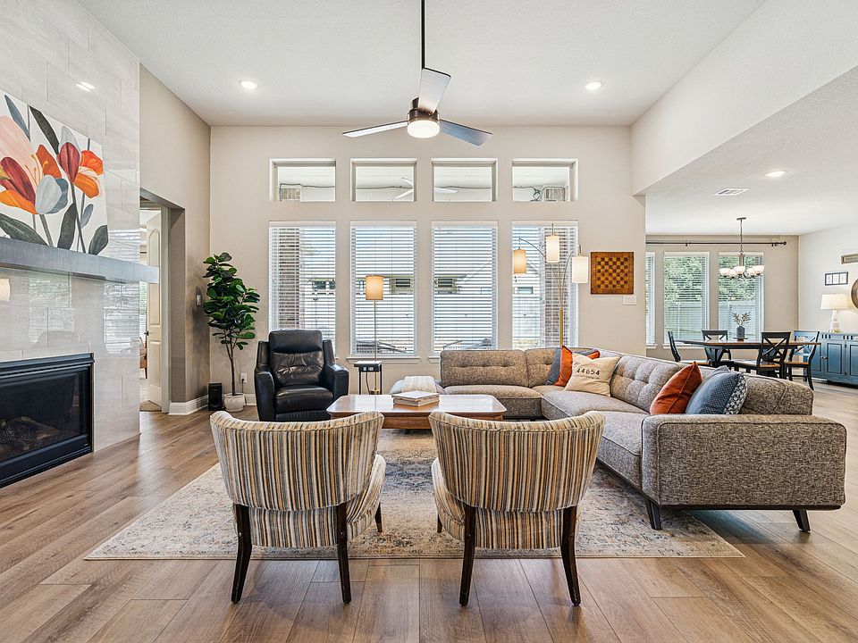 Stunning 2020-built Toll Brothers home featuring timeless stone and brick elevation with 3 bedrooms, 3 full baths, private office, and a spacious 3-car tandem garage. Designed for modern living, this single-story floor plan offers an inviting main living area with a cozy gas log fireplace, ceiling fan, and a wall of windows overlooking the backyard for abundant natural light. The gourmet kitchen is open to the living space and boasts granite countertops, crisp white cabinetry, gas cooktop, large island with breakfast bar seating, and a walk-in pantry—perfect for both everyday living and entertaining. Retreat to the private primary suite with an ensuite bath showcasing dual vanities, garden tub, separate shower, and a generous walk-in closet with direct access to the utility room for added convenience. A secondary bedroom also features its own ensuite bath and walk-in closet, while the third bedroom offers flexibility for family or guests. Additional highlights include a laundry room with built-in shelving and space for a freezer, plus thoughtful design touches throughout. Enjoy the outdoors in the spacious backyard with a covered patio, complete with ceiling fan and beautiful landscaping—ideal for relaxing or entertaining year-round. This well-maintained Toll Brothers home combines style, function, and comfort in a highly desirable community.
