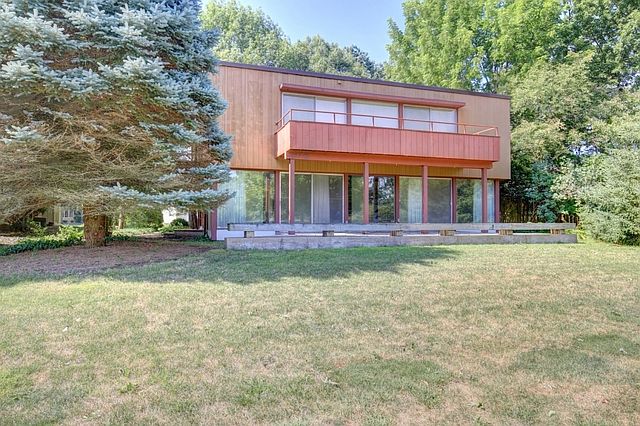 Mid-century modern style home designed by architect John Replinger stands with large views of Lincolnshire Fields Country Club's private golf course. Unassuming exterior provides privacy and yet offers many open areas. The 36' x 15' living room features sliders and large windows to the deck with a panoramic view of the golf course. Hardwood flooring throughout. Master with adjoining den and dressing area plus a private studio above the garage (not included in square footage). Appliances stay but are not warranted. Phinney Branch Mutual Drainage District remaining assessment assumed by buyer.