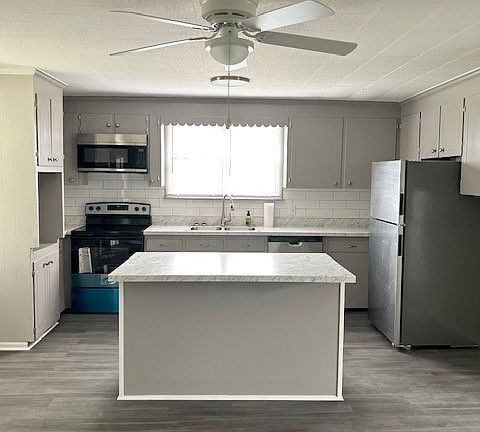 The kitchen features built-in new appliances! Home is ready for move-in ease. Enjoy your mornings on the screened-in rocking chair front porch or unwind under the covered carport.