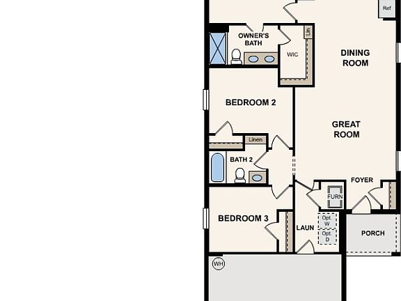 The serene primary suite includes a private bath with dual vanity sinks and a spacious walk-in closet. Two additional well-sized bedrooms and a full secondary bath provide ample space. A two-car garage adds convenience, while energy-efficient Low-E insulated dual-pane windows ensure year-round comfort. Enjoy a 1-year limited home warranty.