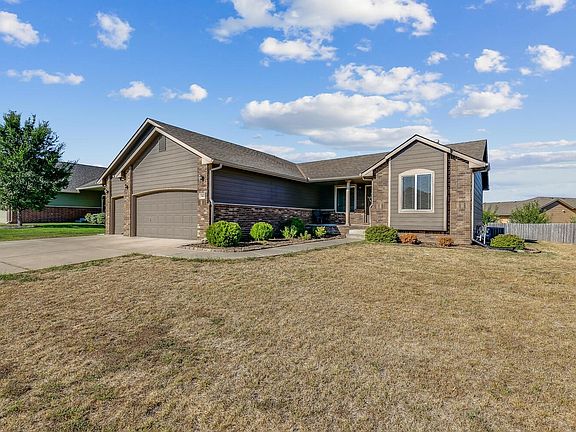 Where Dreams Come Home...spacious 5 bedrooms + finished basement provides over 2500 sq ft of sumptuous living! Interior freshly painted (9/3), carpets cleaned (9/11) & home professionally cleaned...kitchen is fully applianced & washer & dryer to remain. Right around the corner from the new Stone Creek Elementary School. This home features an open floor plan, gas fireplace, sun brightening windows for plenty of natural light, vaulted ceilings, soft close drawers, a walk in pantry, mud room/locker area with additional storage. Covered front porch, back patio, 10 zone sprinkler system & privacy fenced. Master bedroom provides 2 sinks, a separate tub & shower, tray ceiling & walk in closet with shelves. Ceiling fans in the upstairs rooms. 2 nice sized rooms in the basement with daylight windows, large family room provides plenty of space for family night, sitting or game area. Specials are low & almost paid off! Convenient to dining, shopping & an easy commute to Wichita. This house delivers, what more could you want?? Situated in a friendly community. Motivated Seller..bring offers! Sellers are providing a $2800 allowance for exterior painting or buyers choice...Let's Deal.