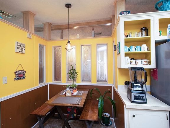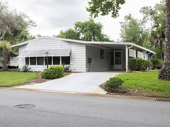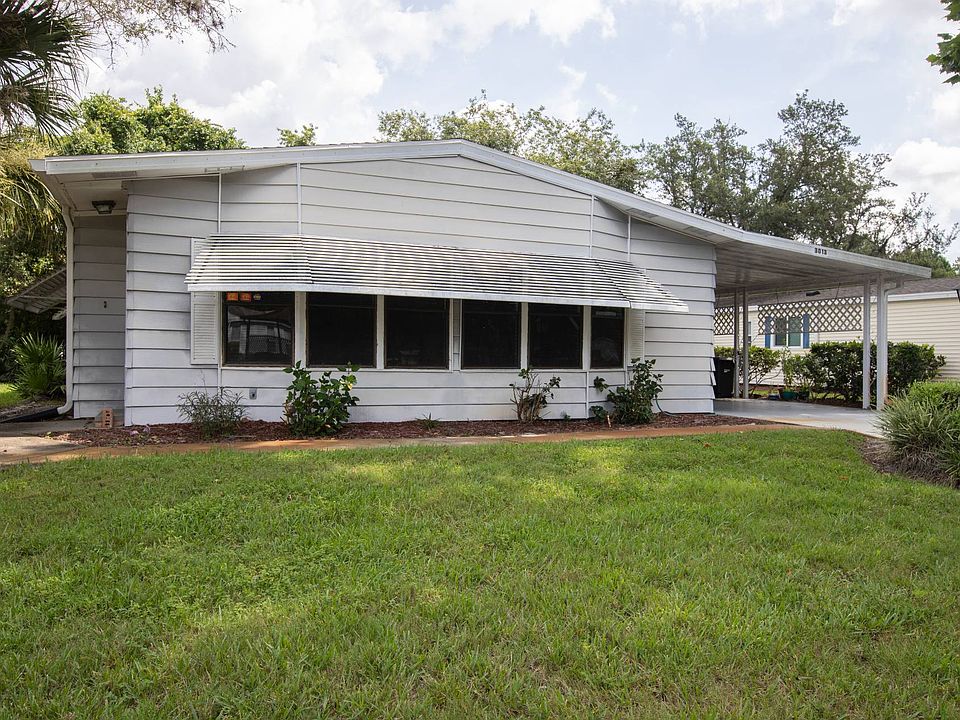 This well kept two bedroom two bathroom 1988 Palm Harbor is situated in a beautiful landscaped resort setting among mature shade trees. Entering through the front door you will find a large family room and dining room with vaulted ceilings, large bay window, eat in kitchen, an abundance of storage space, and a king size primary suite with a private bath. The home features updated wood flooring and a four seasons Florida room with a garden view of the backyard. The inviting clubhouse includes a billiards room, library, bingo hall, and dance floor. Whether you prefer relaxing next to one of two swimming pools or enjoying one of this golf cart community's many activities such as shuffle board, pickle ball, tennis, or teeing off on the nine hole private golf course, Whisperwood is perfect for anyone over 55 who enjoys an active lifestyle. Just a short drive away, exploring historic downtown Deland, with several boutiques and excellent restaurants, is a great way to spend a Saturday afternoon!