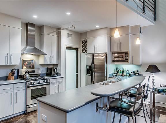 2-story penthouse loft - 9' to 18' to 18' 8" ceilings, Very Cool! Selling furnished, just bring your clothes. European style cabinets, all new lighting, gas fireplace. Walk to Bricktops, Starbucks & the dog park!