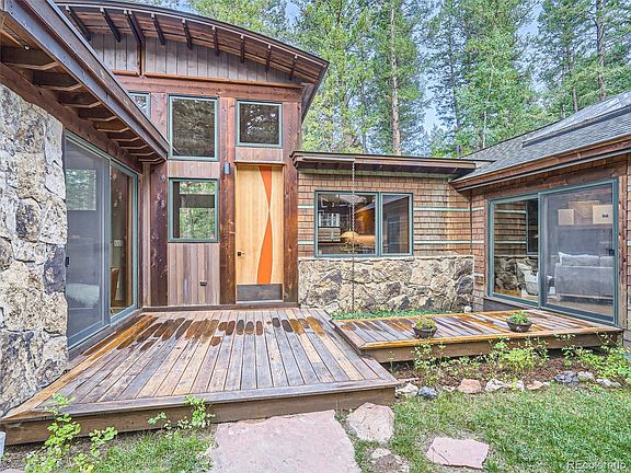 One of a Kind Architectural Masterpiece yet still quintessentially Evergreen. A short walk to Evergreen Golf course, Restaurants and Open Space Trails and Mtn Bike Trails. This Custom built Upper Bear home built by local Architect/Owner, enchants with every detail. Through the courtyard you are greeted by a whimsical hand crafted Oak entry door and enter into the heart of the home with an open layout Kitchen, Living Room, Dining room featuring a vaulted curved T and G ceiling with clerestory windows, Floor to Ceiling Windows and indirect and art lighting. The home is heated by gas fueled Radiant Heat in hand troweled Concrete floors with wood inlays for a cozy barefoot feet. The Main floor boasts most of the living space with almost 2400 sq ft above grade! No bedrooms below grade! From the living room enter the primary suite through the side entrance mudroom/Sitting area with ample built- storage leading to the Primary Suite with walk-in-closet, double sinks, and bedroom with vaulted T and G ceiling perched above the evergreens. The other wing is part of the original cabin and houses the living room with a large stone hearth and wood burning fireplace, large glass doors and Skylights. Perfect for snuggling up to a movie while watching the snow fall outside. Through the living room there is a guest suite to the left with a Bedroom and Bathroom with more T and G and Custom lighting. 2 more bedrooms both with doors leading to the outside and a shared bath and a laundry room with outside access. Don't miss the 2 story tree post on your way to the basement which believe it or not used to be a Diving Pool that now houses the owners studio "Off The Deep End" with 9’6” ceilings or make it a bonus space/work out room complete with Walk-out access. The grounds exude “secret garden” with moss covered rocks, hidden stone steps, wild currants, and sitting spots to just rest and soak it in. Well Water and public sewer so NO SEPTIC to deal with! Don’t miss this Evergreen Gem!