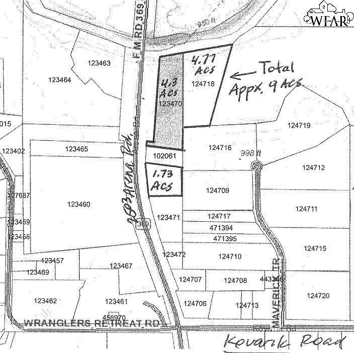 This approx. 11 acres includes a 1.73 acre separate tract to the south (not contiguous, and listed in MLS as 2503 Arena Rd). Approx 9 acres is bordered on the west by a State of Texas Right of Way, and approx 50 ft of frontage on FM 369 (Arena Rd). It is bordered on the north by more than 600 ft frontage of the Wichita River. The 9 acre tract is rugged riverfront land which does have access to FM 369. The 1.73 acre tract is surveyed and platted separately (See 2503 Arena Rd).