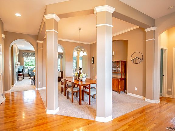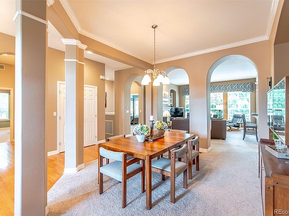 Enjoy a lock-and-leave lifestyle in this ranch style home located in Castle Rock’s Escavera community well-known for low maintenance living with year-round HOA amenities such as snow removal from driveway to front door and a full scope of front yard maintenance. Settled on a corner lot in a quiet cul-de-sac, step inside to find a home well-crafted by David Weekley where architectural details fill this open floor plan. Natural sunlight from southern exposure creates a light, airy atmosphere while the 10 foot ceilings throughout complement each room. Decorative arches surround and define a formal dining room. A Great room complete with gas log fireplace looks out onto the private backyard, then extends into a gourmet kitchen equipped with granite, center island, breakfast bar counter, gorgeous soft-close molded cabinetry, stainless appliances and step-in pantry, establishing a place ready for everyday living or entertainment. An adjoining eat-in area grants access to your own outdoor oasis surrounded by trees for quiet privacy when grilling, hot tubbing or relaxing. Enjoy an expansive deck with built-in seating, hot tub patio, plus garden beds and pathways connecting to the front of the home. A picturesque, secluded backyard is a welcoming backdrop for your primary bedroom suite creating a sanctuary emphasized by an immense ensuite five-piece bathroom. Tucked away from the main living area, to establish a quiet workspace, find a large home office which will accommodate dual working desks. Two secondary bedrooms plus a full bath, as well as laundry room with utility sink complete the first level and a temperature-moderated 856 bottle wine cellar can be found in the finished area of the basement. For the craftsman, a workshop has been established with workbench and drill press table in the remaining unfinished portion of the basement. Other updates include a new roof and exterior paint in 2020 and HVAC in 2021. Welcome to a relaxed, elevated lifestyle!