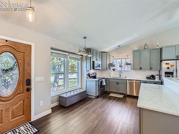 Welcome to your move-in ready home in the heart of Academy School District 20! This beautifully maintained ranch style home in Briargate is the perfect blend of relaxing comfort and upgraded amenities tucked into one of the most desirable neighborhoods/school districts in town * The inviting walk up entry with a long, wide covered patio (a charming, magical space with the patio lights) welcomes you & your guests * Open concept main level with kitchen, dining room with pantry closet, and living room with vaulted ceilings and wood burning fireplace * UPGRADED KITCHEN with gorgeous cabinets & soft close drawers, upgraded stainless steel appliances & granite countertops * 2 bedrooms on the main level including a Primary Suite with vaulted ceiling and en suite bath * The lower level has an oversized 3rd bedroom, bath, family room and updated laundry space with wood accents on the wall * You'll love SO MANY UPDATES: Updated flooring * CENTRAL A/C * Updated electrical * Updated water heater (2021) * Hot tub & cover * Outside is even more! Large lot with mature trees and space to create your peaceful outdoor retreat * Tons of room to run, play, garden, entertain etc. Home will be getting a new roof and exterior paint in back!