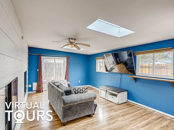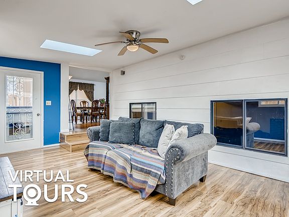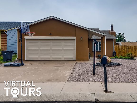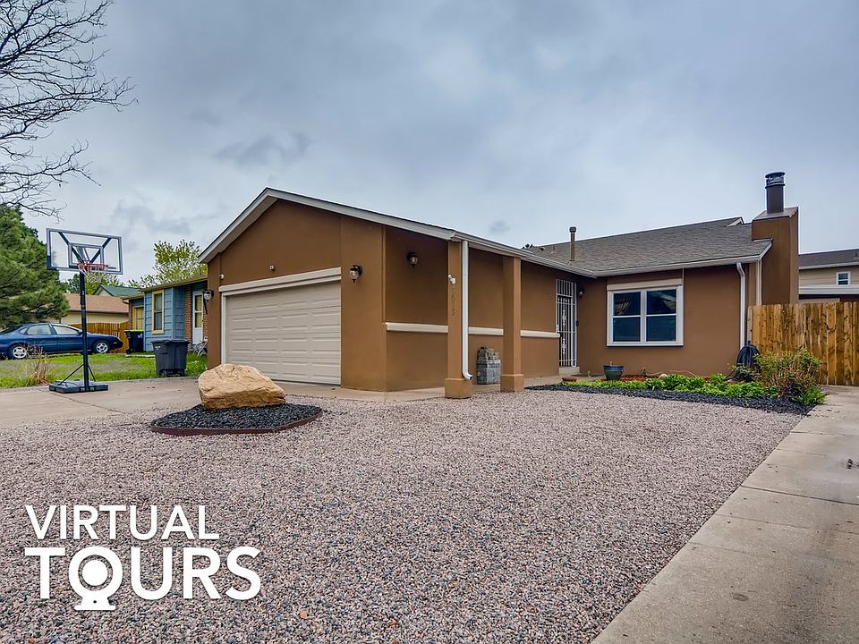 Light-filled 4 bd / 3 ba home that boasts a gourmet kitchen, sunroom/den add on, and finished basement with bedroom! The home has great curb appeal, as well as a gated front porch that adds privacy and security. Once inside, notice the abundance of natural light, reflecting off the wood floors and beaming through the skylights, windows, and glass doors. The home's flowing layout allows you to seamlessly transition from room to room: relax in the sunroom/den, host dinner parties in the dining room while the wood burning fireplace crackles, and cook in the large eat-in kitchen, equipped with granite countertops, upgraded stainless steel appliances, and glass tile backsplash. When it's time to wind down, opt for any one of the upstairs bedrooms; the primary has an ensuite bath with a granite countertop and tiled shower, while the others share the full hallway bath. The basement has a living room, bonus bedroom/office, laundry area, and bath, containing a glass enclosed standup shower. Head to the fenced-in backyard to find a cement patio for BBQs and low maintenance rock landscaping. Other features: 2-car garage; Custom windows; Speaker/media package; Sprinkler system; Alarm. Located near shopping, dining, and trails, with easy access to COS Airport, Downtown, Ft Carson, and Peterson AFB! Buyer should verify all information.