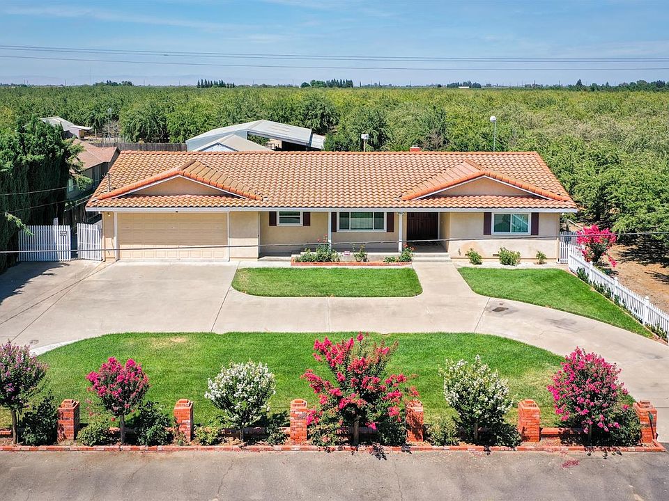 Pride of ownership & original owners showcasing this country living ranch. Spacious driveway and landscaped front yard transitions into the double door entry to the open living room with imported Italian porcelain tile floor throughout this custom-built home. Bedrooms feature real wood floors. Guest bath has Jack & Jill entries with bath/shower option & bidet. Large dining room with bar option to the Kitchen. Granite countertops, backsplash and painted cabinets to match. Laundry room features built in cabinets w/ desk & sink. 2nd bath features walk-in shower. Attached 2 car drive-thru 35' garage w/built-kitchen, dbl sink, granite countertops, stove/range & cabinets. This 19-acre property features 18 acres of 13 yr. old Butte/Padre almonds on prime soil! Workshop, lg covered barn for farming equipment. Backyard features garden area, lawn, covered attached patio and multiple species of fruit trees and special plants. In addition, an animal area with small barn structure and fence