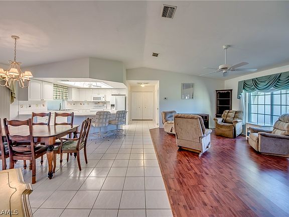 If you’re looking for an absolutely adorable home with a great big yard, look no more! You’re going to love this Country Club neighborhood of well maintained homes. Perfect investment, year round or vacation destination! Located in a central, yet off the beaten path, popular part of SE Cape Coral. You’ll love this easy, location with quick access to everything. Spacious three bedroom split bedroom floorplan with over 1500 square feet. Big windows & sliders plus cathedral ceilings give this home a great feel with loads of bright, splashing Florida sunshine! Large kitchen with plenty of cabinets, island breakfast bar & walk in pantry. Master suite is spacious and has a nice large walk in closet. Large screened lanai to the beautiful back yard. Lush lawn & beautifully landscaped yard. Just a great area of homes! Easy access to Veterans pkwy, schools, shopping, restaurants, beaches & short drive to the airport. Impact glass windows & shutters on lanai. Well maintained home with minimal storm damage (already repaired) will be fine for VA or FHA financing if desired. Plenty of room for a pool! You’ll LOVE … NO HOA fees, NO assessments & NO flood insurance required. Sold as furnished.