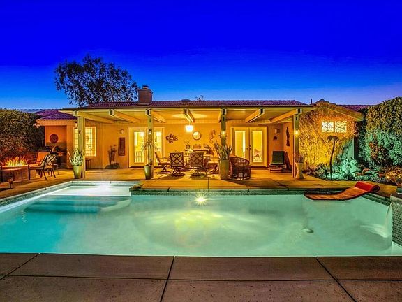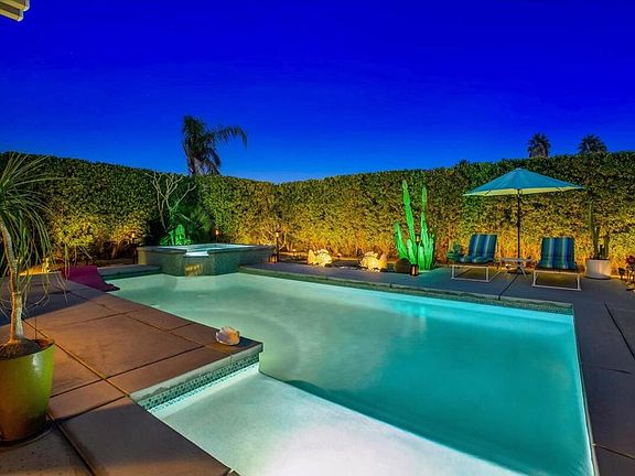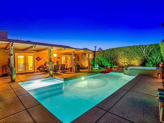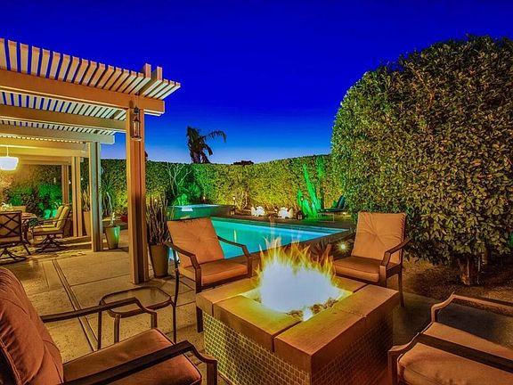 Your showplace awaits. Curb appeal sets the tone--desert landscape accented by mature Paloverde trees. All freshly painted interior with spacious layout perfect for gathering & entertaining. Vaulted ceilings. Unique dual sided/see-through fireplace divides great room from dining area. Generous kitchen boasts plentiful counter & cabinetry space, stainless appliances & breakfast bar. French doors (from both living area & primary suite) open to picture-perfect backyard paradise! Lush hedges & citrus frame an ideal resort-style saltwater pool with tanning shelf & elevated spa + waterfall spillover. Covered alumawood-style patio cover provides shade along entire back of home. PLUS, delightful fire-pit entertaining area. Block walls provide privacy & security as well as showcase mountain views above & beyond! Popular neighborhood known as Upper Outpost, non-gated, no HOA dues. FOUR bedrooms, 2 bath home. Primary suite with soaking tub & separate shower. Tile flooring throughout, carpet in bedrooms & living room. 2-Car attached garage; laundry room inside home with storage cabinets. Minutes from downtown Palm Springs, hiking trails, casinos, shopping, dining, freeway close + easy airport access! Enjoy gorgeous interior, lounge poolside, entertain, stargaze--this is the IDEAL remodeled property to call HOME. STOP searching and START living!