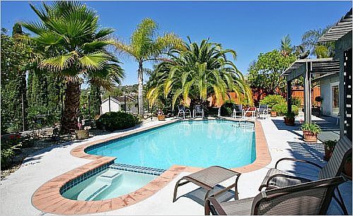 Impressive 3BR/2BA, 1916esf single. Lush, tropical landscaped priv back yd with gorgeous pool/spa & large trellis covered patio areas. Glass wall across the back yd creates an open view of evening city lights and nearby hills/mtns. Recently remodeled kit offers cherrywood cabinetry, beautiful gran countertops with full backsplash and black glass apps. Newer interior paint/carpeting. Cus window coverings throughout. Abundance of windows and patio doors. Volume ceilings. RV parking. No HOA/mello.