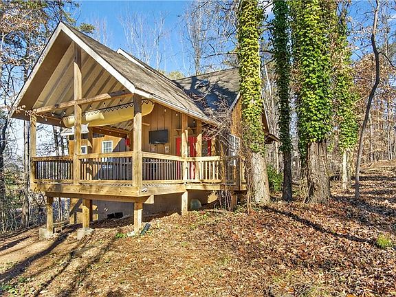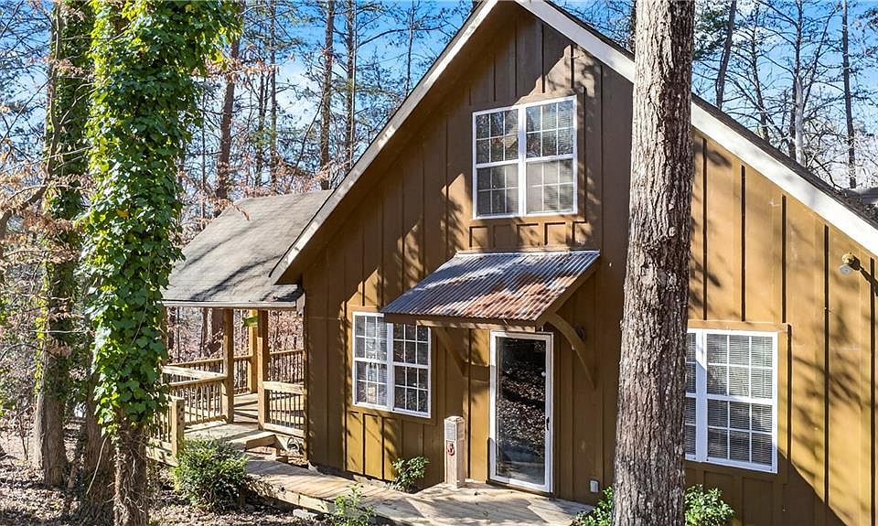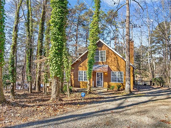 Move-in ready cottage in "A Quiet Place in the Woods" neighborhood, steps from community dock & boat launch on Lake Lanier! Wooded cul-de-sac lot has extra back driveway - ideal for private boat storage - leading directly to the n'hood amenities area. Built in 2008, this could be a dynamite primary or vacation/investment home. Main level great room, eat-in area, & kitchen are all open to each other. Awesome 16' x 16' covered side deck/porch w/hanging canoe decor is THE place to enjoy morning coffee and evening beverages...and don't miss the fire-pit beyond the porch for those late night endeavors! Large walk-in cellar/crawl space provides plenty of storage w/full access to systems & structure. Real hardwood floors on main level; stacked stone fireplace w/bookshelves; nice stained upper & painted lower cabinets in kitchen, along with stainless appliances & white bead-board backsplash; insulated windows; large laundry room on main level. One BR & BA on main, two BR & full BA up - excellent roommate plan. HVAC system replaced in 2024, water heater replaced in 2023. Laid-back neighborhood is gated, and includes public water & sewer, boat docks, boat storage, clubhouse, pool, tennis courts, street lights, and more. All this in a serene lake setting, yet still close to civilization and downtown Gainesville. Easy lake living at a great price!
