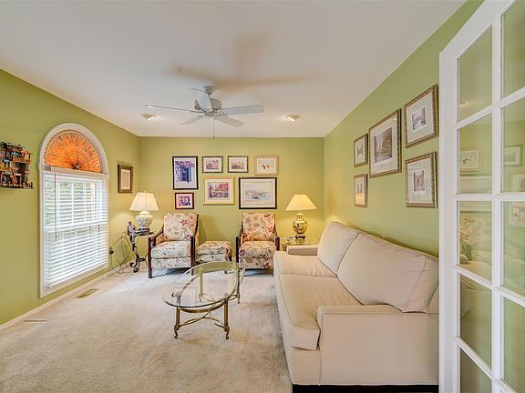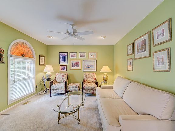 Beautifully landscaped with inground sprinkler system so your yard will always looks nice. Office to left of entry foyer with double french doors for some privacy. Nice size great room with windows on either side of wood burning fireplace (which has been converted to gas logs) and vaulted ceilings make it feel even bigger. The formal dining room is open to a great room. The kitchen has a granite counter top, center island, wood floors, plus newer stainless steel appliances, double oven, built-in microwave, breakfast room. Vanity in Primary bath is adult height with granite counter separate tub and shower. Vaulted ceilings in the primary bedroom too and a walk in closet. The basement is right off the garage and main floor laundry. The covered porch is perfect for that morning coffee or evening glass of wine.