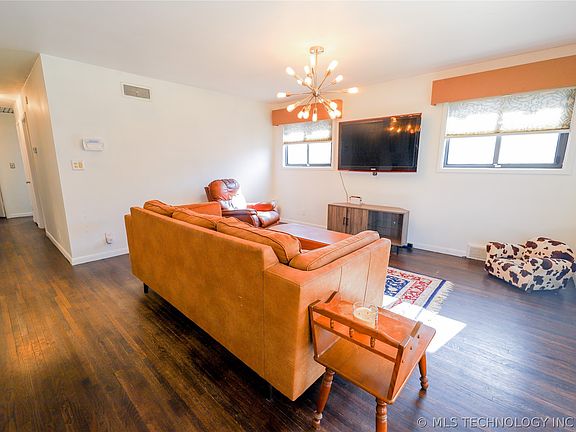 This is a beautiful mid century home with 3 bedrooms, 2 bathrooms and 2 living areas. The hall bath has a whirlpool tub and the den has a fireplace. The home has the original hardwood floors. The kitchen has been updated and is equipped with double wall ovens and a new dishwasher. The HVAC system is less than 2 years old. The backyard has an amazing, large covered patio.