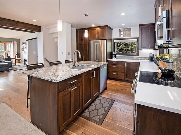 Beaver Creek ski views from this remodeled 3 bed, 2.5 bath, 1 car garage townhome w/yard & deck space. Upgrades include a builders quality high end kitchen remodel with Bosch appliances, granite island and caesarstone countertops, custom soft close cabinets & drawers, walk in pantry. Open kitchen leads to the new main level powder bath and an extended living/dining area. New wide plank wood flooring, sky lights, a high efficiency wood burning stove. Trex deck- walk out to a lush backyard.