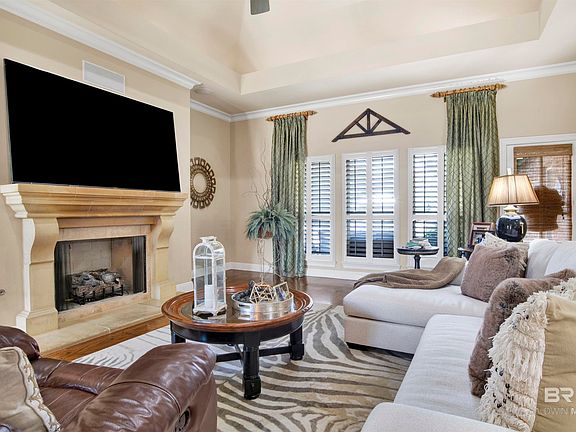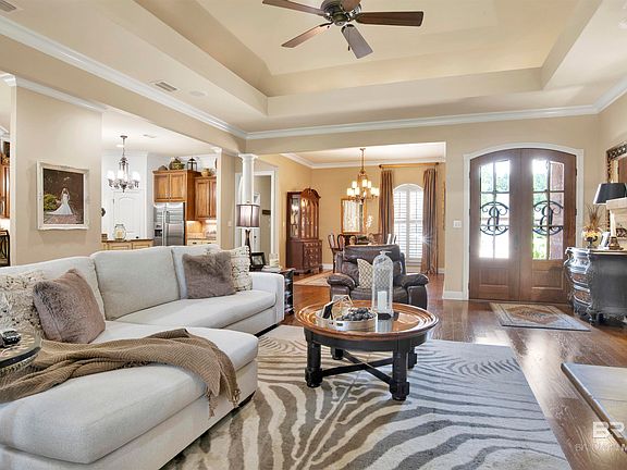 Stunning Home Loaded with Upgrades located in highly desirable Golf Course Community TimberCreek. Step through solid wood double doors into this beautifully designed home featuring solid hardwood floors, open floor plan 10’ ceilings, and an impressive 18’ cedar ceiling in great room. Beautiful concrete fireplace mantle provides the perfect focal point. Enjoy the charm of plantation shutters, crown molding, recessed lighting, and surround sound. Kitchen boasts granite countertops, solid wood cabinetry, stainless appliances, a center island, and breakfast bar. All closets and pantry offer auto-lighting and custom wood shelving. Relax in the spacious primary bedroom with ensuite bath with double sinks, separate shower, and forced-air jetted tub. No carpet, Newer roof (2019), central vac, sprinkler, and alarm system included. Neighborhood amenities include pools, clubhouse, workout room, tennis and pickleball courts and more. Rockwell/ Spanish Fort Schools. Convenient to Schools, Shopping, and I-10. This home blends elegance and comfort—schedule a showing today! Buyer to verify all information during due diligence.