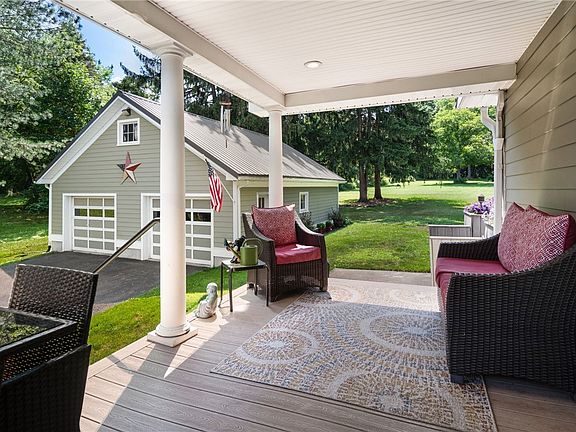 OPEN HOUSE Saturday, August 10th 11:00-12:30PM. Welcome to this meticulously maintained ranch home, nestled on a sprawling 2.66-acre lot. This immaculate property boasts 3 bedrooms and 2 bathrooms, offering ample space and comfort. Step inside to find beautiful solid oak floors and elegant ceramic tile throughout. The spacious, bright living area is a true highlight, featuring a wood fireplace, and a dining room with built-ins that add both charm and functionality. The kitchen is equipped with modern stainless-steel appliances and a 5-burner gas stove, perfect for culinary enthusiasts. The large, finished basement provides additional flex space, complete with a workshop, for your DIY projects, a storage room, and space for a home gym or guest area. Outside, you'll find a large deck with a hot tub, ideal for relaxation and entertainment. The property also includes a 2-stall detached garage, offering plenty of storage space on the second floor. The meticulously landscaped grounds feature a charming stone wall, adding to the overall appeal of this home. Every corner of this property reflects care and attention to detail, making it ready for the next
