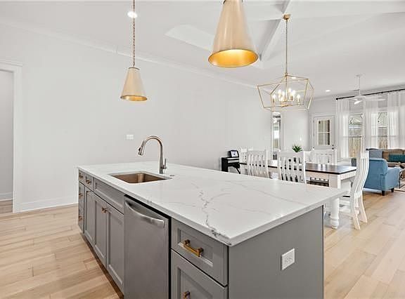 Welcome to your stunning Garden Home nestled in the Southern Oaks Subdivision of Madisonville. Crafted less than five years ago by Depp Construction, this residence boasts a timeless blend of Hardy Plank and Brick, accentuated by majestic Cypress columns. Step inside through the elongated foyer, designed to grant you extra privacy, and enter into a luminous expanse encompassing the kitchen, dining, and living areas. Illuminated by natural light, this space is adorned with a charming gas fireplace and offers seamless access to the covered back patio, perfect for entertaining or quiet relaxation. Indulge your culinary senses in the chef's kitchen, where custom cabinets, quartz countertops, and a glass backsplash harmonize with stainless steel appliances and a generous island. A walk-in pantry ensures ample storage space for all your gourmet essentials. Retreat to the serenity of the primary bedroom, featuring a thoughtfully curated accent wall for added allure. The primary bath beckons with its spa-like ambiance, boasting a luxurious garden tub, tile shower, double vanity, and custom closet. Adorned with hexagon tile floors and mirrored mounted sconces, every detail exudes elegance and comfort. Convenience meets functionality with a mudroom and adjacent desk area off the laundry room, complete with a utility sink for added utility. Across the street, the community pool and pavilion offer opportunities for leisure and recreation, while the greenspace to the left of the home enhances the sense of tranquility. Welcome home to a sanctuary of style and sophistication, where every detail has been meticulously crafted to elevate your lifestyle. Flood zone C designation provides peace of mind, ensuring your home is as resilient as it is exquisite.