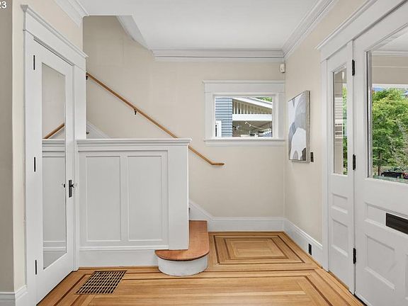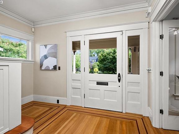 Beautiful American Foursquare on tree lined street in Historic Irvington Neighborhood just blocks to Starbucks Coffee, Whole Foods Grocery, and Irving Park. Full covered front porch with high-end Ipe wood just completed in 2021 and screened by mature plantings provides a private perch to enjoy morning coffee or relax in the evenings. The main level features original inlaid hardwood flooring and built-ins. Formal living room with wood burning fireplace and original double hung sash windows. Light filled formal dining room with leaded glass and bay windows, built-in buffet and box beamed ceiling. Thoughtfully remodeled kitchen is the perfect space for entertaining with room for everyone, featuring beautiful quartz counters, large 9'3" x 37" island with seating area, two sinks, stainless steel appliances including two high-end dishwashers (Bosch & Asko), built-in 64" wide Electrolux refrigerator and freezer, wine refrigerator, newer resin infused stranded hardwood flooring, and tons of storage space. Spacious sunken den located just off the kitchen with custom made built-in wine rack with interior lighting to accommodate 368 regular and 6 magnum sized bottles of wine. The second level features four bedrooms and two full bathrooms including one of the two spacious primary suites with heated tile bathroom flooring. The third level provides the additional primary suite with full bathroom and sitting room for an ideal private retreat. The lower level includes a large family/media room with fresh paint, additional storage and laundry/utility room. Fully landscaped back yard with large concrete patio and mature plantings including a fruit bearing fig tree makes a great space for outdoor gatherings. Long private driveway for off street parking with sturdy garage.*Notable features include - New furnace in 2022, Full exterior paint in 2022, Newer wood and original wood windows, central air conditioning on main and second floors, mini split on third floor primary and more! [Home Energy Score = 1. HES Report at https://rpt.greenbuildingregistry.com/hes/OR10204230]