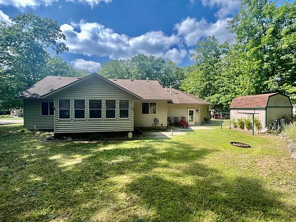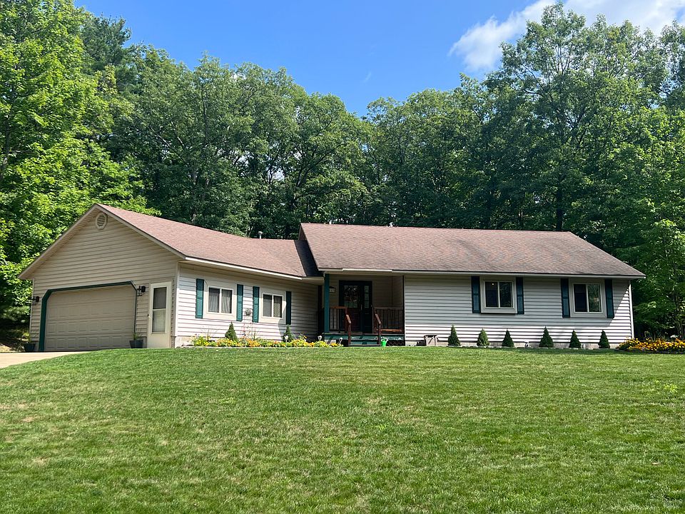 Custom built home with Lake Margrethe public access and adjoining federal property to the back. 3 B/R 2 Bath, vaulted ceiling in great room. Split floor design, three seasons porch and central a/c. Kitchen offers island bar, hardwood floors, solid surface counter tops, stainless steel appliances and walk in pantry. Insulated & finished garage, generator, storage shed and concrete driveway. Updated furnace, H/W heater, and drain field. Double lot with natural gas.