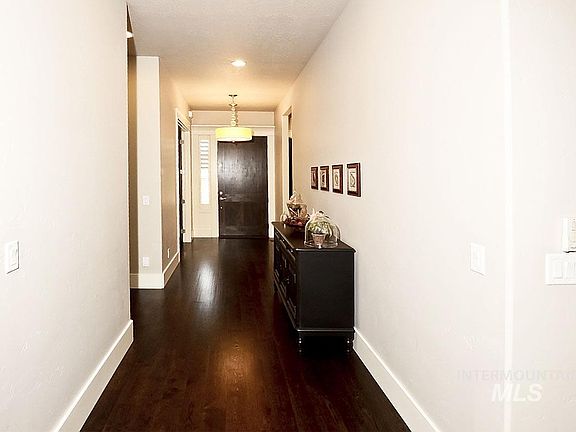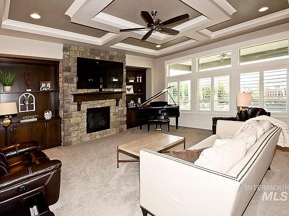 Come see this Stunning single level home in one of Eagle's most desirable neighborhoods. Built by James Clyde it shows attention to detail in every room. Inside there's a front office with glass French doors and wainscotting. Follow the dark hardwood floors into a great room with built in shelving, floor to ceiling stone fireplace and crowned coffered ceiling painted just right to bring out the warmth of this room. The kitchen is a gourmets delight with an island for six, double oven, custom cabinets with accent lighting below and above, Thermador appliances, full subway tile backsplash and light granite counters sprinkled with brown perfect to complement the dark wood. The secluded Master has a coffered ceiling private bath with double headed walk in shower, soaker tub and leads to a 17x10 walk in closet. From the laundry mud room step into a 1580Sq. Ft. 48ft. deep RV garage with full epoxy floors. The covered patio overlooks a meticulously landscaped yard with mature trees on this .30 acre corner lot.