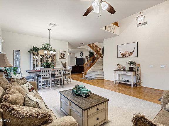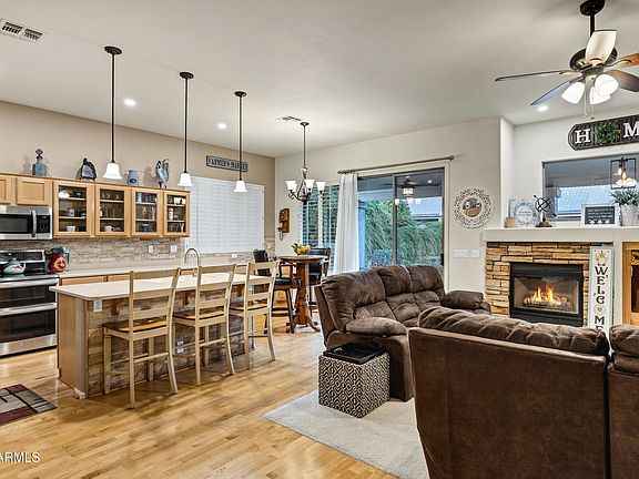 Fabulous value located on a great neighborhood in Mesa! This well-maintained 4-bed, 3-bath home features a large bonus room, 3-car garage w/ pass-through garage door to backyard, stone veneer accents and grassy/gravel front yard. The fantastic interior will impress with its plantation shutters in all the right places, family room w/fireplace, and spacious living/dining room. The remodeled kitchen includes stainless steel appliances, maple cabinets w/ glass inserts, Corian countertops, island w/breakfast bar & upgraded lighting. Spacious primary suite has walk-in closet, an immaculate bath with double sinks & separate tub/shower. Huge backyard offers an extended covered patio with grassy landscape and plenty of room for a pool. This one is THE one...welcome home to Sossaman Estates!