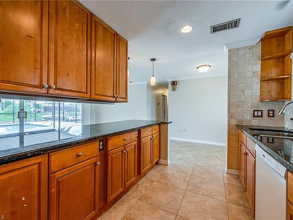 Wow factor lives here. Spectacular waterfront location, walk to Del Prado shopping. Direct sail boat access. No bridges. Total wall of sliding doors open to the pool area. 5 minutes to river. 3 bedroom 2 bath 2 car garage with great indoor laundry room. Some updates in 2013 to include new roof, pool deck, updates in kitchen, crown molding, tile floors, newer windows and all assessments are PAID in full. Great opportunity for direct access under $320K. Easy to show and see. Traditional Floorplan. Large living and dining room.