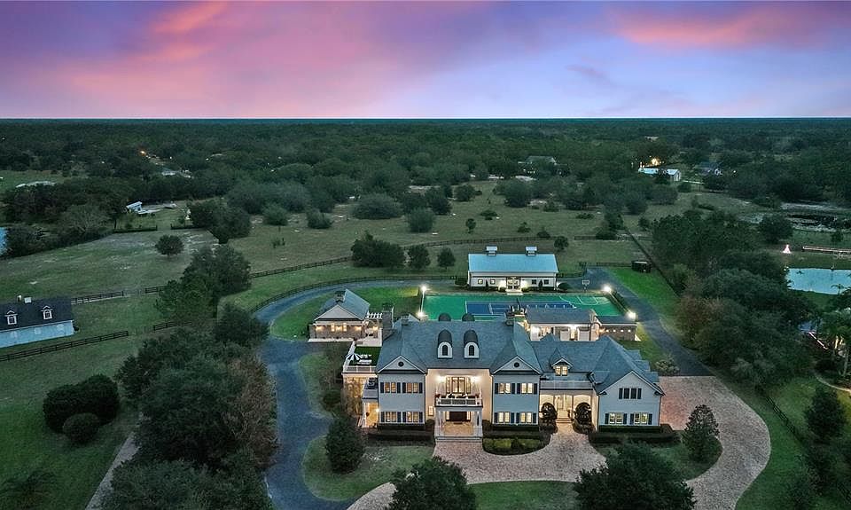 This home isn’t for the faint of heart … it’s a showstopper. Just under 14,000 ft.², 5 buildings, 13.75 neat & tidy acres in the double gated enclave of Mills Cove. 30 mins to DT Orlando, less than an hour to the beach, 10 minute helicopter ride to the airport, yet you’ll feel like you’re on your country estate. The quintessential entertainment home radiates quality with a hyper-luxe moment around every bend. The undeniable quality of this developer’s personal dream home, is evident from the moment you cross the threshold into the 2014 Parade of Homes Custom Showcase GRAND AWARD WINNER by Hill Gray Seven’s Gregg Hill. Set back an acre, guests are greeted in neo-colonial style, with the pomp & circumstance one expects for heads of state. Travel around from either gate, to the front stone entry or round either corner to the property edges, then head back to the two bedroom guest cottage w/ stable beyond, or (on the other side) past the sports complex/tennis/pickleball/basketball courts to the stables. Saunter in from the grande front portico and you’ll be transported to an era when hospitality, ease & decorum were to be expected. Once inside, you’ll be warmly welcomed by a 2 story entrance gallery flanked by (4) 13’ double arched custom mirrored niches. Left to the 2 story, wood paneled study & fireplace w/separate entry, a British inspired sports pub/trophy room, a powder room w/hand laid marble mosaic tiles. Head right you’ll find the Fibonacci-esque spiraling staircase anchored by the game playing studio. Entertainment meets unencumbered formality. The grande living room, fireplace & hearth is opposite the kitchen w/ triple thick rockface edged slab, 12’x 16’ kitchen continent. Sweeping views of the resort sized aquatic playground just beyond. Kitchen adjacent are breakfast & wine tasting rooms, showcase pantry, craft room, 2nd powder room, mud room, doggy bathroom (w/shower, separate tub, washer/dryer & pups potty access). The sunroom hosts formal dining & music conservatory anchored by it’s weighty brick fireplace & hearth. Upstairs, the primary bedroom, faux turf deck for lounging, improving your putting game, or surveilling your dominion. The primary bath is a work of art with hand laid leaf marble mosaic tile harkening to the 11th century Moorish Maallem’ craftsmen. 3 en-suite bedrooms, a bunkhouse, billiards room, home theatre, 2 additional turfed decks, a 3rd story bonus room provide space for everyone to “do their thing”. A 2nd staircase, provides additional access & flow. The pool accommodates your entire guest list, sunken summer kitchen & swim up bar serves meals under sunny skies, or sur la nuit étoilée. A 2 bdrm guest cottage w/ kitchen & fireplace keeps guests comfy & well accommodated. Fitness studio overlooks pool & tennis courts, tennis viewing platform easily seats 12. The freestanding yoga/dance studio adjoins the tennis courts and al fresco lounging patio is an ideal vantage point to watch a good match. The payoff for good workout is a relaxing aromatherapy steam shower. The 5 stall aisle barn & tack room is immaculate, grooming stations, trainer’s studio apartment, full length hayloft/storage. Paddock for turning out or a manège, cleared acreage behind the stables is for riding, establishing an orchard, or both. Familiar and comfortable, even the deer feel relaxed here, meandering without hesitation. So will you. Broker is Lic'd Real Estate Agt. MLS details to be verified by buyer