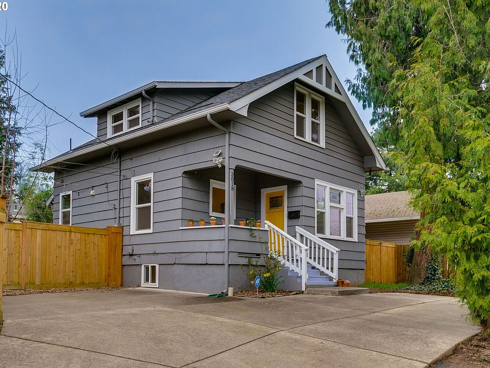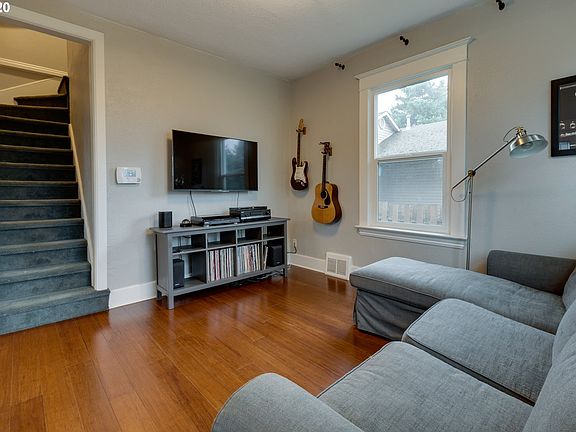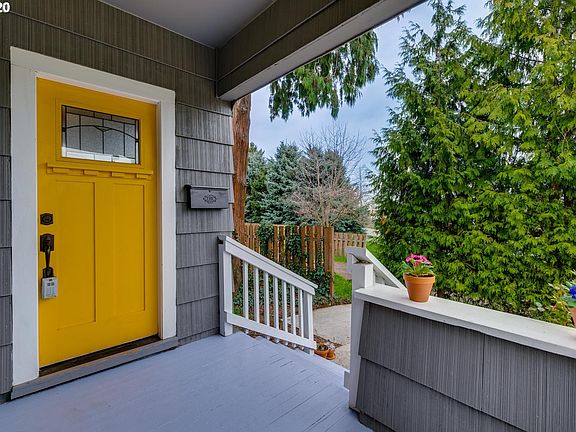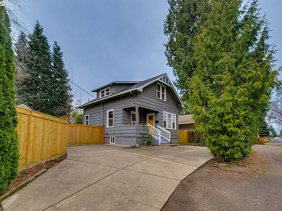 Cozy PDX Classic. Cvrd frnt prch. Wd flrs on main level. Open cncpt dining&kitchen w lots of storage &counter spc, ss appl. Bk dr to patio& lg fnced bk yrd. Trees block yrd from neighbor&street view=private. 1 bdrm & bthrm on main, upstairs 3 more rms! 1 feat built-in bkshlf & full closet, 2nd w dbl closets, & 3rd is ideal for office or wrkspce. Plenty of storage upstairs. Fnshed Bsmnt is ready for your vision! Hobby space, laundry, & more! Park 3 cars on paved drvwy. Near Trenton &Kenton Parks. [Home Energy Score = 5. HES Report at https://rpt.greenbuildingregistry.com/hes/OR10142006]