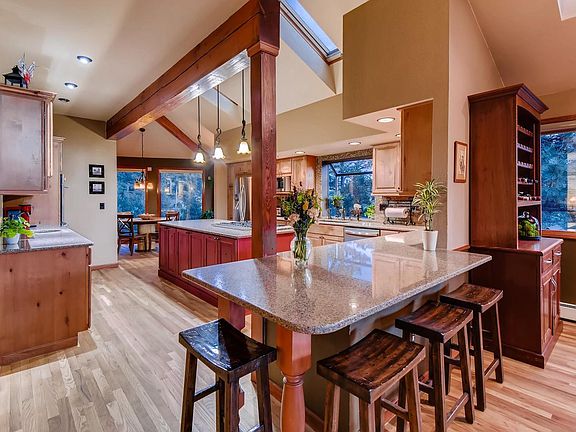 Luxury redefined! Extensively remodeled Mountain Contemporary in a Premium Setting. Private, Peaceful Site with views of Mountain & Golf Course view and direct access to the Open Space Trail that goes all the way to Evergreen Lake! Main Floor Master Bedroom with Private Deck and Gas Fireplace, and a large adjacent Study. A stunning new Knotty Alder Kitchen! Cozy Living Rm with fireplace. Majestic Great Rm with walls of glass framing the mountain view. Awesome 1000sqft Deck, with Custom Pergola, to enjoy the views and Abundant Wildlife. There's even a cool removable movie screen! Three Large Bedrooms upstairs and two baths, plus a Loft with a view and a Big Deck. The Full Walk-out Lower Level offers a beautifully remodeled Rec Rm, another bedroom and all-new bathroom, plus a Workout Room that is Bedroom #6 if you wish. Still there's 900 sqft unfinished, with outside access for you to finish or enjoy the storage.