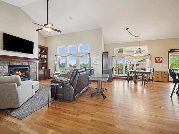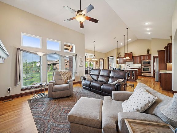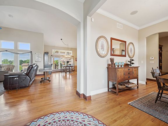 Tucked away in the Fox Ridge Estates Addition, this corner lot property is a treasure! The attention to detail and the thoughtful layout makes this home both beautiful and functional. The 14 foot vaulted ceiling and hardword floors create an open and warm entrance. The kitchen features granite countertops, stainless steel appliances against dark maple cabinets and a large pantry. The Hearth room is highlighted by a gas fireplace with built-ins on both sides. The Dining Room, just steps away from the kitchen, easily fits a big table. The main floor also offers a split bedroom plan with the main bedroom entrance from the kitchen. It features a coffered ceiling, bay window, electronic shades, large, spacious walk-in closet, and an on-suite bath with jacuzzi tub. Off the hearth room there are two large bedrooms that have walk-in closets with a shared bath. The drop zone near the garage entrance and laundry room is a practical addition, featuring cubbies, hooks, and a bench. Heading downstairs you will notice 9' ceilings, a wet bar, a very large Rec room/family room that has generous spaces for a pool/ping pong table along with plenty of room for television viewing with the built in entertainment center next to a gas fireplace. The downstairs also has a split bedroom plan with two large bedrooms both with walk-in closets and separate baths. The fitness/bonus room adds versatility to the space. There are 3 large storage spaces in the basement, including the 11x24 safe room which is located under the garage. The appeal of this home extends beyond its interior, with a large, fenced back yard offering open space for outdoor activities and relaxation. With a basketball/sports court included, it becomes a hub for fun and games. Overall, this home is like a haven of comfort and luxury, perfect for both everyday living and entertaining guests. All information is deemed reliable but not guaranteed, anything relied upon, must be independently verified by the Buyer or the Buyers' representatives. Don't miss out on the opportunity to make this stunning home your own! Call today for a private showing!