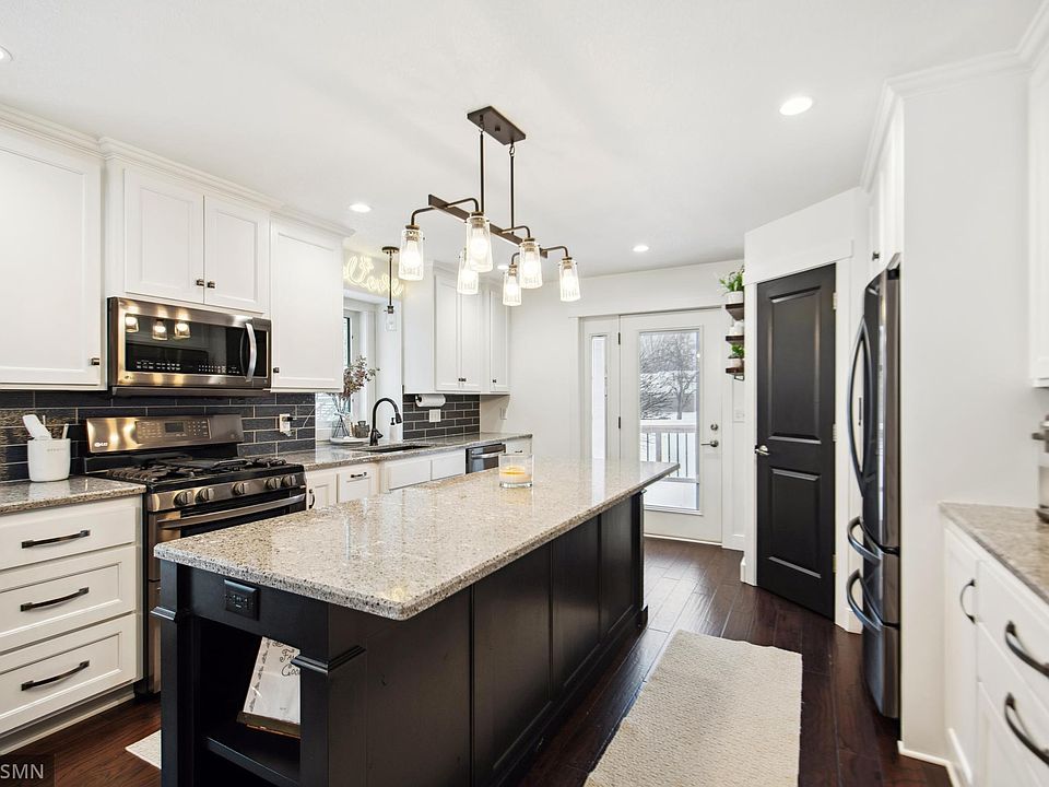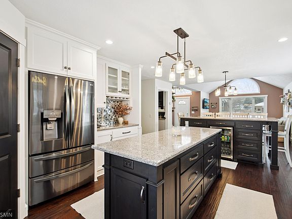 The Kitchen is a Wow! Kitchen remodel is perfect for entertaining with beverage cooler, coffee bar and lots of storage/counter space. Beautiful 3 bed 3bath 3 level home in Little Canada. Completely remodeled kitchen with granite countertops and two islands, new appliances, open floor plan with hardwood floors on main level. All 3 baths updated, new roof and windows 2023, new furnace 2019, new patio slider door, new garage doors, bump out driveway for third car, new concrete sidewalk to brick front home, located on quiet cul-de-sac a few blocks from lake. Easy highway access. This remodeled home offers lots of storage with cement floor crawl space.