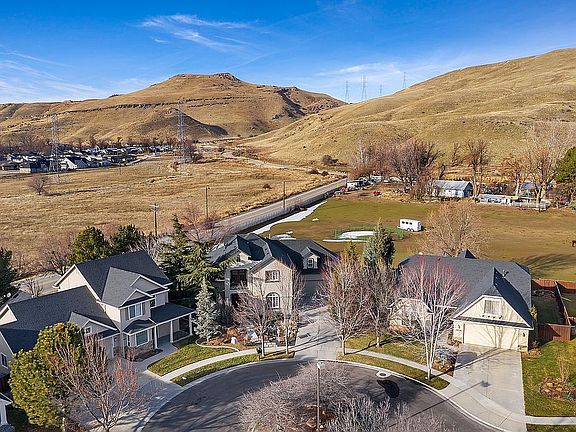 Highly coveted Harris Ranch home is perfectly placed in quiet cul de sac with views of the Boise foothills.Ceilings soar and light streams throughout the spacious, flexible living space.Impeccable kitchen sparkles featuring stainless steel appliances, granite countertops, custom cabinetry.Lives like a single level w/ master suite on main level & guest rooms, bonus room above.This former Parade home defines timeless design with quality finishes like custom solid wood front doors, plantation shutters, crown..