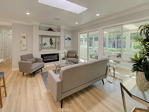 Completely remodeled luxurious "Casa Del Mar" model, located conveniently in gate 7, no stairs, end unit, no one above and below. Amazing open concept, bright & light, 2 bedrooms and 2 bathrooms. Spacious master bedroom with walk-in closet, large walk-in shower. Essential kitchen with impressive quartz counter tops, custom back splash, inviting island, skylights, high quality stainless steel appliances, custom designed cabinet with soft close door drawers, interior features an added built-in multi-use closet for additional storage, attractive wood-like laminated flooring, smooth ceiling, crown moldings throughout, LED recessed lighting, new dual pane windows, and sliding glass doors. Brand new central heating & air conditioning, and washer/dryer...Enjoy all the wonderful amenities of the Laguna Woods Village 55+ senior community has to offer- 7 clubhouses, 5 pools, 3 golf courses, 2 fitness centers, tennis courts, stable, free bus service and more.....