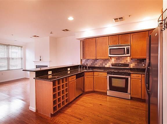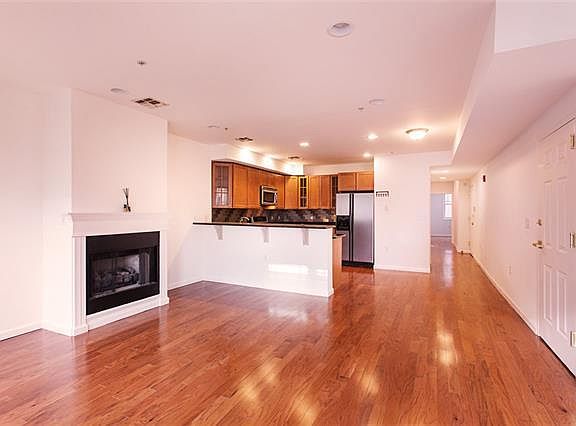 Steps to NYC Bus, PATH, and Washington Street. Take the elevator up four floors to this modern home that features a spacious layout with great natural light. The open kitchen features granite counters, custom cabinets, stainless steel appliances, breakfast bar and dining table. The master bedroom features a full bath and walk-in closet. The second bedroom is a great size and also has an abundance of closet space. Enjoy the gas fireplace in the winter and the Juliette balcony in the summer. Built in 2007. Rental parking is available nearby.