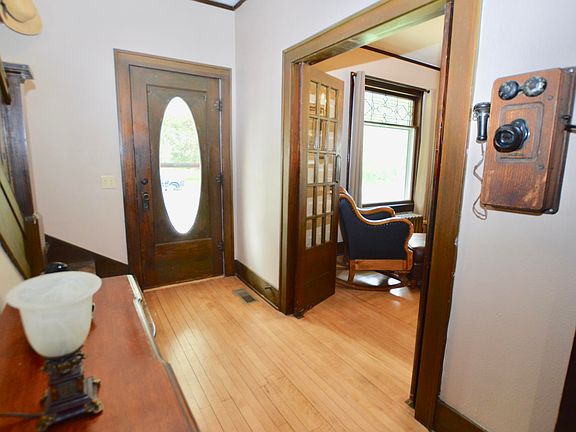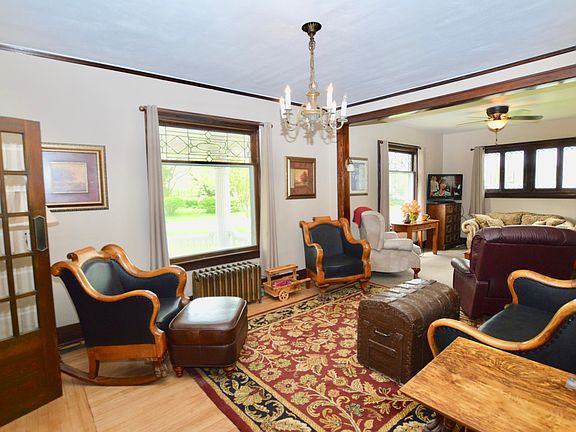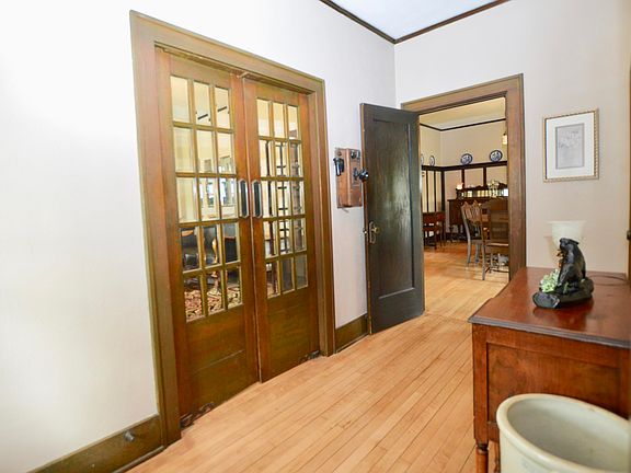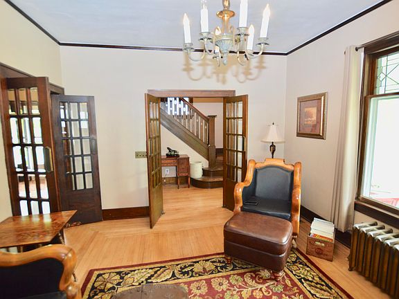 Beautiful and incredibly well maintained 5 bedroom, 2 bath historic home includes lovely original hardwoods, lead glass windows, round front porch, master bedroom balcony, and sunrooms off bedrooms 3 & 4. 3+ Stall garage built in 2018. New shingles and 4 new storm doors, 2017. Large lot planted with a variety of trees and blooming perennials.
