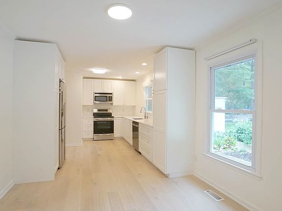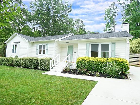 Light, bright and airy ranch style home in beautiful downtown Cary neighborhood. Fully-renovated kitchen w/ white cabinets, stainless steel appliances & white marble countertops. Large open living space with vaulted ceiling & white brick fireplace. Gorgeous French Oak wood flooring throughout house. Three generously-sized bedrooms w/ tons of closet space. Primary BR has updated en suite bathroom, while 2nd & 3rd BRs share a spacious updated hall bath. French doors from living room lead to an English-style gravel patio w/ raised garden beds & lovely area for outdoor dining. The cleared level lot has plenty of lawn space to relax, entertain or play. A detached backyard studio makes a perfect home office. Newer HVAC (2018), washer & dryer (2018), new concrete driveway (2022) & all new windows (2023)—truly move-in ready! Prime location less than a mile from schools & new Downtown Cary Park, and just down the road from Fenton shopping & dining. The picturesque neighborhood with sidewalks & tree-lined streets offers a pleasant stroll into town. Serene & stylish one-floor living in the middle of all Cary has to offer!
