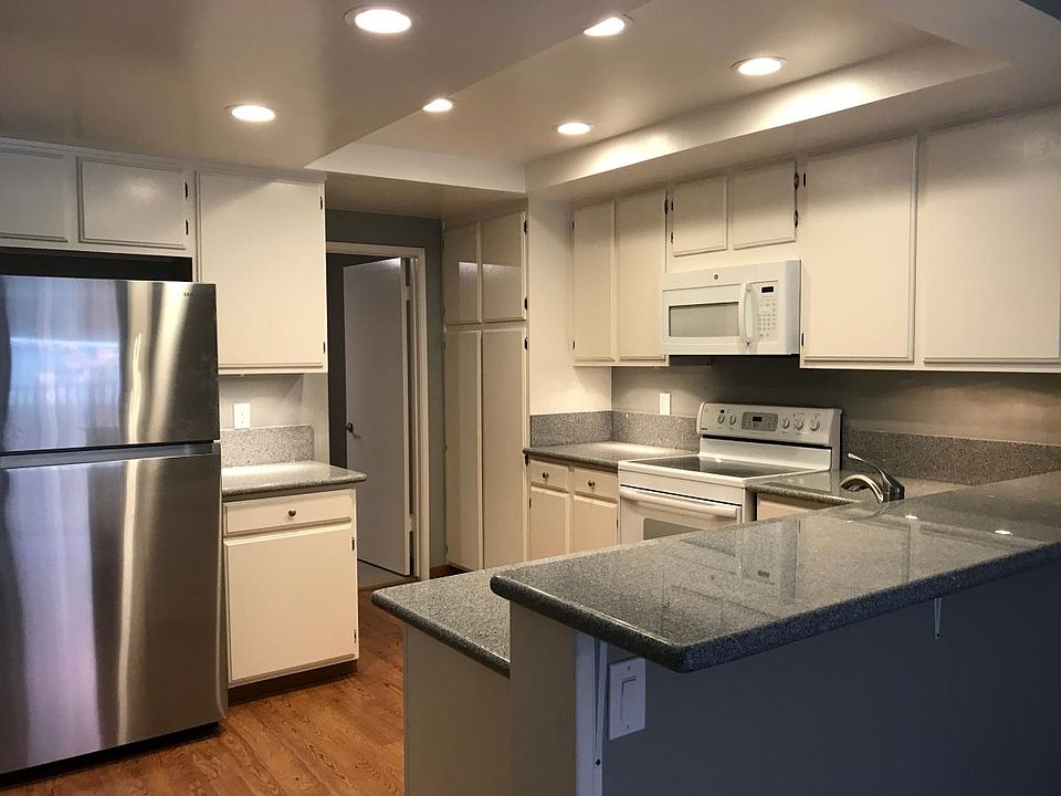 Wonderful location in downtown Alamo within walking distance to restaurants, shopping and the Iron Horse Trail. Tastefully updated with newer carpet, paint, lighting and much more. Spacious kitchen with granite countertops, stainless refrigerator and designer lighting adjoins family room looking out to enclosed patio. Large living room with gas fireplace and separate dining room, sliding doors leading out to deck overlooking creek and trees. Upstairs offers 2 separate bedroom suites with additional loft area and laundry room. Lots of storage, a two car garage, mature landscaping, community pool (closed at this time due to COVID)and gated entrance. One year or more