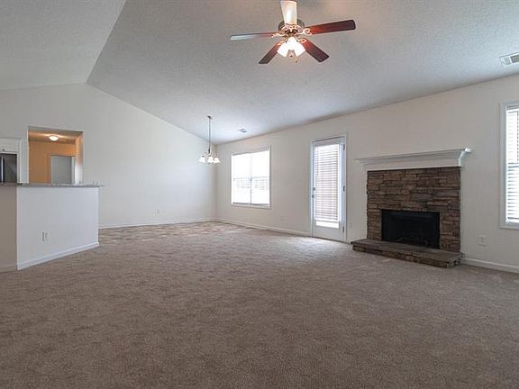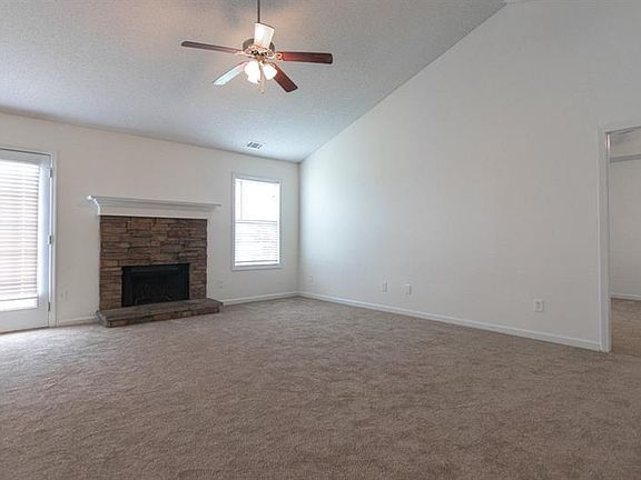 Great ranch with rocking chair front porch with stone and low maintenance vinyl siding. This open floor plan has vaulted ceilings for lots of drama! Family room has rich stone fireplace and is completely open to bright kitchen with white cabinets, smooth-top electric range, and microwave. Master suite has tray ceiling, walk-in closet, separated vanities, garden tub and separate shower. Bedrooms 2 & 3 are spacious, have ample closets and share a full bath with oversized vanity. Great outdoor space includes patio and huge flat yard. Close to Pleasant Hill Church Rd and hyw 211. Water heater replaced-2017.