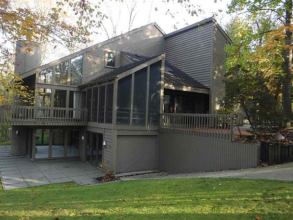 Spacious unique contemporary home designed by Rich Hersha in desirable Fallen Timbers! Gorgeous very private wooded lot with 2.19 acres including a creek and footbridge. There's a screened porch and wrap around deck to enjoy the views. Finished walk-out basement with rec room , fireplace and wet bar plus 4th bedroom and a full bath. There is also a 3rd bay garage on the lower level listed as "shed" in listing plus a large storage room. The master bedroom has a huge closet, designer bath with stain glass shower door and a balcony with a circular stairway. Two more bedrooms are on the upper floor as well as the laundry room. The stairwell has an open two story bookcase with access ladder and the half bath has a two story ceiling for a dramatic effect. This home has easy access to shopping, banks, restaurants, hospitals, library, Family YMCA and I-69. This home is priced to sell - there have not been upgrades to the kitchen or baths so the home is priced accordingly. You have a great opportunity to significantly increase the value with your own selection of design and decor. There's no other home with a gorgeous secluded lot like this one in this price range!