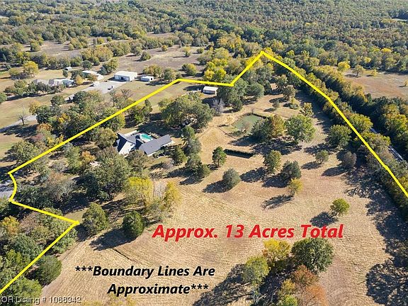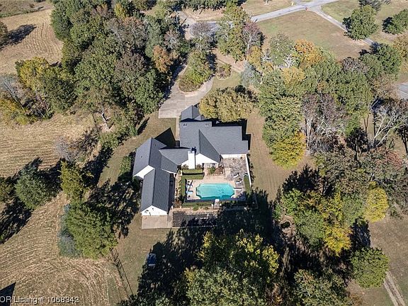 Beautiful home & pool/guest house on 13 +-acres! Main house has 3 or 4 bedrooms & 2 1/2 baths. Large den has fireplace, built-ins, wood floors. Living room has vaulted ceiling, wainscoting, 2 sets of French doors to patio/pool area. Study has wood floor, large built-in, fireplace, crown molding, double doors, & closet. Could be a bedroom, if desired. Formal dining can be flex space for whatever you want! Spacious kitchen has built in oven, micro/convection, glass cooktop, pull-outs in cabinets, pantry, large island w/bar, room for table in eating area. Primary suite is on main level. Tray ceiling, chair rail, doors to the pool. Huge primary bath has tub, shower, double sinks, large closet. 2 bedrooms & jack/jill bath are upstairs. Sunroom has tile floor and floor drain, making it easy to grow plants. Now for the pool/guest house! It has a large gathering room with plenty of room for a pool table. Kitchen has granite, refrigerator, range, Ice machine, micro, & wrap around bar. Real mini theater complete with furniture, equipment, big screen, surround sound, Alexa powered colored lighting in ceiling! Primary Suite with large bath, cedar closet & safe room. 35 x 18 diving pool w/plenty of patio area for furniture, wrought iron fencing, outdoor speakers. 10 acres of pasture, stocked pond w/fishing deck, huge insulated shop w/2 sliding doors, storage building, water well for irrigation, raised garden beds. Home has solar power & Generac generator. There's so much to enjoy in this truly amazing property!