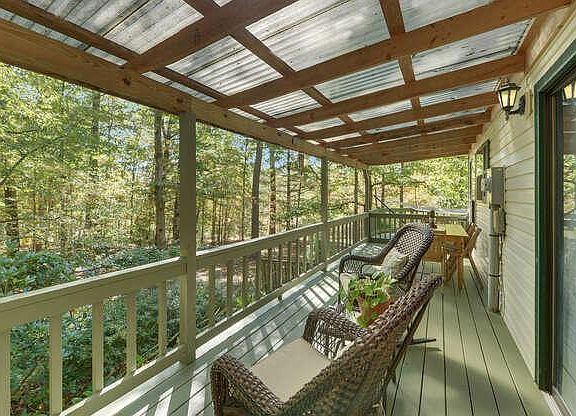 - Exterior: Porch, Wooded Lot, Private Location, Deck, Garden Spot, Fence, Wrap Around Deck
