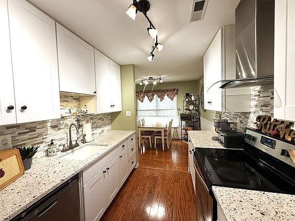 The finished walk-out lower level adds approximately 600 square feet of living space, featuring a large family room, with extra space for a craft area or place to workout , under-stair storage closet, and a stylish sliding wood barn door leading to the mechanicals and a workbench. Step out onto the lower patio complete with a storage shed and enjoy the beautifully landscaped, level backyard. This unit also comes with two designated parking spaces as well as guest parking.