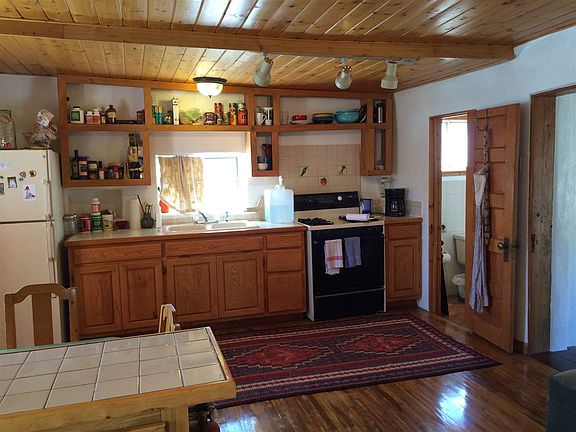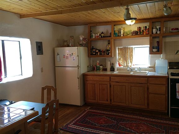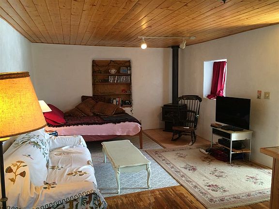 NIFTY and THRIFTY. This in-town adobe has an open floor plan with spacious living area and bright kitchen. Tenants have a baby grand in the bedroom so there is plenty of room for the bed in LR (See photos). Natâl gas makes heating a breeze. The oversized utility room accommodates the closet as well. There is a deck in back for enjoying mountain views and fenced yard for privacy and pets. An attached garage could be converted to studio, more living space, or leave as is for storage and garage. The convenient location allows easy access to stores, schools, hospital, and the great outdoors. Super for starter home, rental, or retirement.