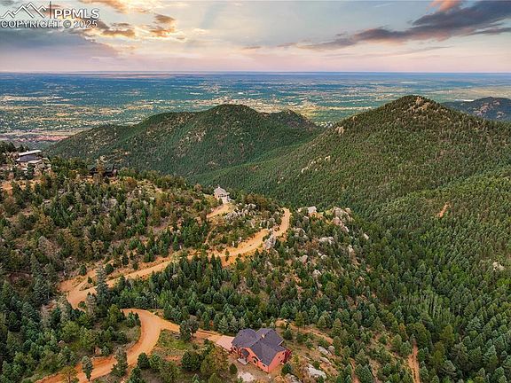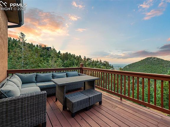 Exquisite custom rancher on a 0.60 acre lot in the Manitou Springs community of Crystal Park. Captivating 360-degree city & Mtn views! Open floor plan w/hardwood floors & high ceilings. The Entry leads into the 1st ML BR w/dual closets & an Ensuite Bathroom. Convenient Powder Bathroom. The Dining Rm opens to the Island Kitchen for easy food service & clean up. The Kitchen offers a pantry & abundant cabinets w/granite tile countertops. Appliances include a trash compactor, gas cook top, vent hood, & brand new double ovens, dishwasher, & side by side refrigerator. Dining Nook off the Kitchen w/addtl cabinetry & pantry for storage. Walk out to an expansive deck that spans the entire back of the home from the Nook, Great Rm, or Primary BR where you will be astounded by the fabulous beauty at your doorstep! The Great Rm offers a wood-burning fireplace w/commanding floor to ceiling stacked stone surround, hearth & custom mantle. French doors lead into the Primary Owner’s Suite w/high ceiling & 5pc Ensuite Bathroom. The Bathroom offers a dual sink vanity, jetted tub, separate shower, & dual walk-in closet w/built ins. The 9f Basement provides a Mud Rm, garage access, & Laundry Rm w/cabinets. There is a Family Rm w/walk out to a covered patio, 3 Bsmt BRs (1 currently used as an office) & a Full Bathroom w/BR access between 2BRs. At the end of a long day, you can relax in your own Finlandia sauna! Addtl amenities incl a central vac, generator w/hook-up & separate panel, & an underground propane tank. Crystal Park is an exclusive gated community that provides a clubhouse w/expansive deck & heated swimming pool. Residents enjoy the playground, pickleball, tennis, volleyball, & basketball courts, & a stocked trout pond for fishing that also serves as an ice-skating rink in the winter. Miles of hiking trails lead into Pikes National Forest. This is a spectacular home not far from Manitou Springs shops & restaurants, & an easy 30 min drive to downtown Colorado Springs.