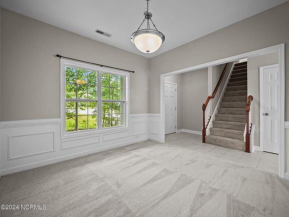 Welcome to 302 Elk Court, a stunning 3-bedroom, 2.5-bathroom home situated on a generous .35-acre lot in the heart of Jacksonville, NC. This beautiful property features a long-paved driveway leading to a two-car garage, with a paved walkway guiding you to a charming, covered porch. Step inside to a welcoming foyer that opens up to a spacious, carpeted living room with vaulted ceilings, crown molding, and a cozy gas fireplace. The living room seamlessly connects to the kitchen, where you'll LVP flooring, a pantry, stainless steel appliances, and a breakfast bar. The eat-in dining area provides a lovely view of the backyard, making it ideal for family meals and entertaining. Convenience is key with a walk-in laundry room and a half bath located on the main floor. Upstairs, you'll discover three bedrooms, including two carpeted rooms with reach-in closets and a shared full-sized bathroom. The primary bedroom is a true retreat, boasting tray ceilings, a spacious walk-in closet, and an ensuite bathroom featuring dual vanities, a walk-in shower, a soaking tub, and a separate toilet area for added privacy. Enjoy the backyard this summer with a screened-in porch overlooking the expansive backyard, perfect for morning coffee or evening relaxation. The home is conveniently located near the community pool and playground, offering fun and leisure for the whole family. With a short drive to local schools, shopping, Camp Lejeune, and the beautiful Crystal Coast Beaches, this home is ideally situated for both comfort and convenience.
